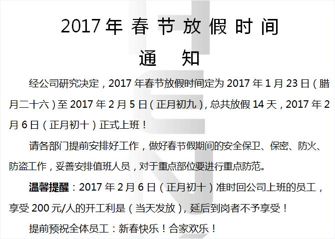 春節(jié)即將來臨,漢高機械決定在2017年1月23號開始放春假,有關(guān)各種業(yè)務的客戶請注意請注意請注意,為避免假期期間可能造成不必要的損失,請?zhí)崆鞍才藕霉ぷ鳎匾氖虑檎f三遍!
