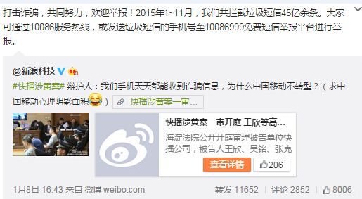 除了互聯(lián)網(wǎng)巨頭,中國(guó)移動(dòng)也成為快播辯護(hù)人用來(lái)反駁的說(shuō)辭。王欣辯護(hù)律師稱:“公訴人老是問(wèn)快播為什不轉(zhuǎn)型?那就我問(wèn)問(wèn),我們手機(jī)里老是收到詐騙短信,怎么沒(méi)讓中國(guó)移動(dòng)轉(zhuǎn)型?。俊贝嗽捯怀?,嚇得中國(guó)移動(dòng)趕忙發(fā)微博: