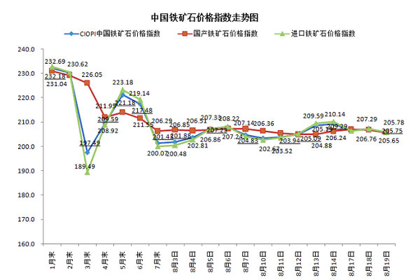8月19日,中國(guó)鐵礦石價(jià)格指數(shù)(CIOPI)205.75點(diǎn),環(huán)比下降1.43點(diǎn),降幅為0.69%。其中:國(guó)產(chǎn)鐵礦石價(jià)格指數(shù)為205.65點(diǎn),環(huán)比下降1.11點(diǎn),降幅為0.54%;進(jìn)口鐵礦石價(jià)格指數(shù)為205.78點(diǎn),環(huán)比下降1.52點(diǎn),降幅為0.73%。