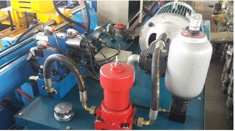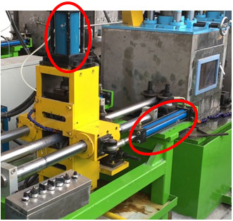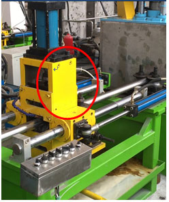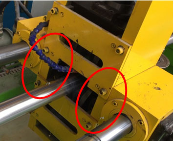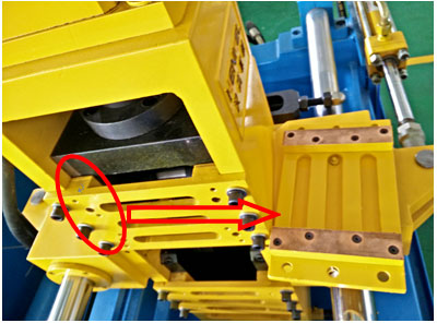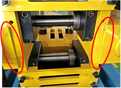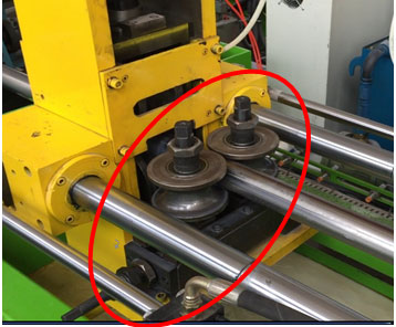 五、漢高正品的立輥合模機構(gòu)上,采用光軸加鋼套與水平??蚯度牍潭ǎ环轮破穭t隨便用了一組制管機上的立輥機構(gòu)。如下圖所示: