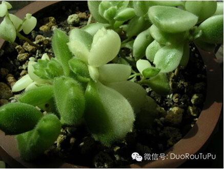 6. 錦:肉肉顏色上的一種變異,多呈現(xiàn)出黃色、白色或粉色?;旧蠒诿趾竺婕右粋€錦字,如XX錦,帶個錦的很難得,一般出錦之后就會身價倍增。如下圖熊童子白錦。