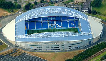 布賴頓社區(qū)球場開放于2011年5月。從開始時起,該球場的設(shè)計(jì)就留有擴(kuò)建余地,并且早在2011年12月,就制定了擴(kuò)建計(jì)劃。2012年初,布賴頓獲得規(guī)劃許可,并且在2012-13賽季開始之前,新增5,000個座位,在2013年初,再次增加3000個座位,這使得該球場的容量增至3.05萬個座位。該球場的主要特征是宏偉的波浪拱形鋼制頂棚結(jié)構(gòu),該設(shè)計(jì)意在襯托周圍的石灰?guī)r山巒。主看臺上方的頂棚是半透明的天藍(lán)色,再加上可以反光的銀色墻面覆層,進(jìn)一步強(qiáng)化了自然光線。由于采用最新設(shè)計(jì),頂棚重量僅為101千克/平方米,從而成為這種形式的大跨度頂棚的行業(yè)標(biāo)桿。該球場在設(shè)計(jì)上達(dá)到最高環(huán)保標(biāo)準(zhǔn),獲得BREEAM(英國建筑研究院環(huán)境評估方法)“非常好”評級。這一點(diǎn)的實(shí)現(xiàn)有賴于三點(diǎn):通過減少建筑材料的數(shù)量,盡量減少二氧化碳排放量;優(yōu)化絕緣標(biāo)準(zhǔn);以及盡量減少能源消耗和廢物產(chǎn)生。整個球場共用去4200噸結(jié)構(gòu)鋼材(2011年數(shù)據(jù))。