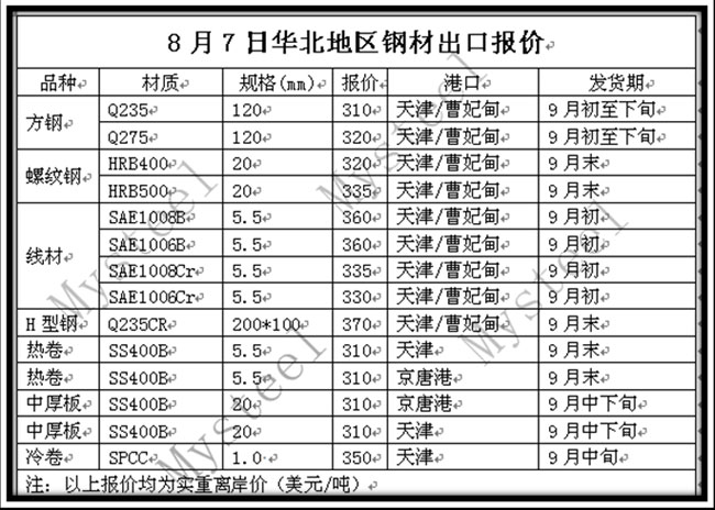 這是中國(guó)8月7日華北地區(qū)的鋼材出口報(bào)價(jià),在全中國(guó)來(lái)說(shuō)是比較有代表性的,基本代表了中國(guó)8月份的鋼材出口價(jià)格了,有相當(dāng)大的參考性。