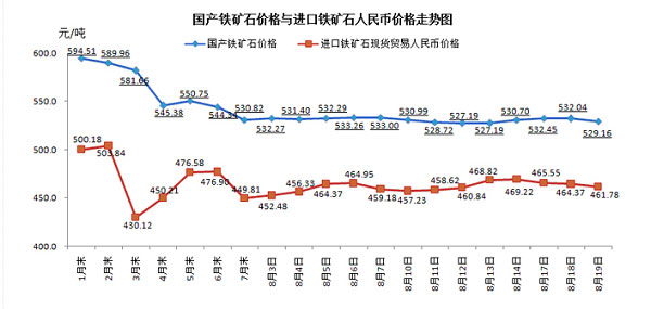 8月19日,國(guó)產(chǎn)鐵礦石62%品位干基鐵精礦含稅價(jià)格為529.16元/噸,環(huán)比每噸下降2.88元,降幅為0.54%,比進(jìn)口鐵礦石高67.38元/噸,升高幅度為14.59%;當(dāng)月平均價(jià)格為530.82元/噸,比進(jìn)口鐵礦石高68.99元/噸,升高幅度為14.94%。