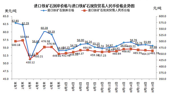 8月19日,現(xiàn)貨貿(mào)易進(jìn)口鐵礦石62%品位干基粉礦人民幣含稅價(jià)格為461.78元/噸,環(huán)比每噸下降2.59元,降幅為0.56%,當(dāng)月平均價(jià)格為461.83元/噸。