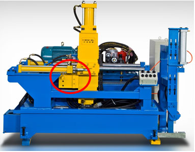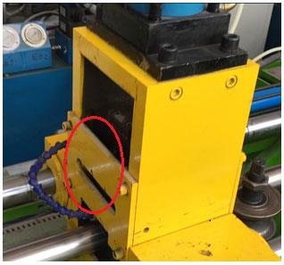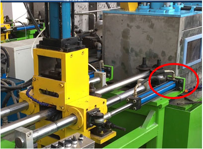 五、漢高正品的立輥合模機構(gòu)上,采用光軸加鋼套與水平??蚯度牍潭ǎ环轮破穭t隨便用了一組制管機上的立輥機構(gòu)。如下圖所示: