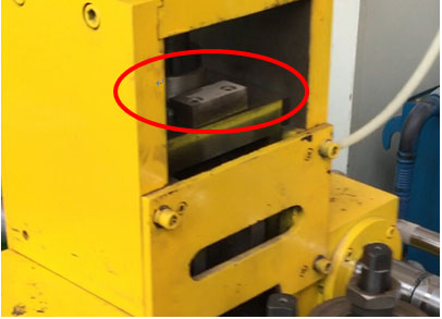 三、漢高正品用銅片來摩擦模具輥框,保證模具壓管的垂直性又減少磨損量;仿制品則只用一塊鐵塊來定位,磨損厲害,整平效果大大降低。如下圖所示: